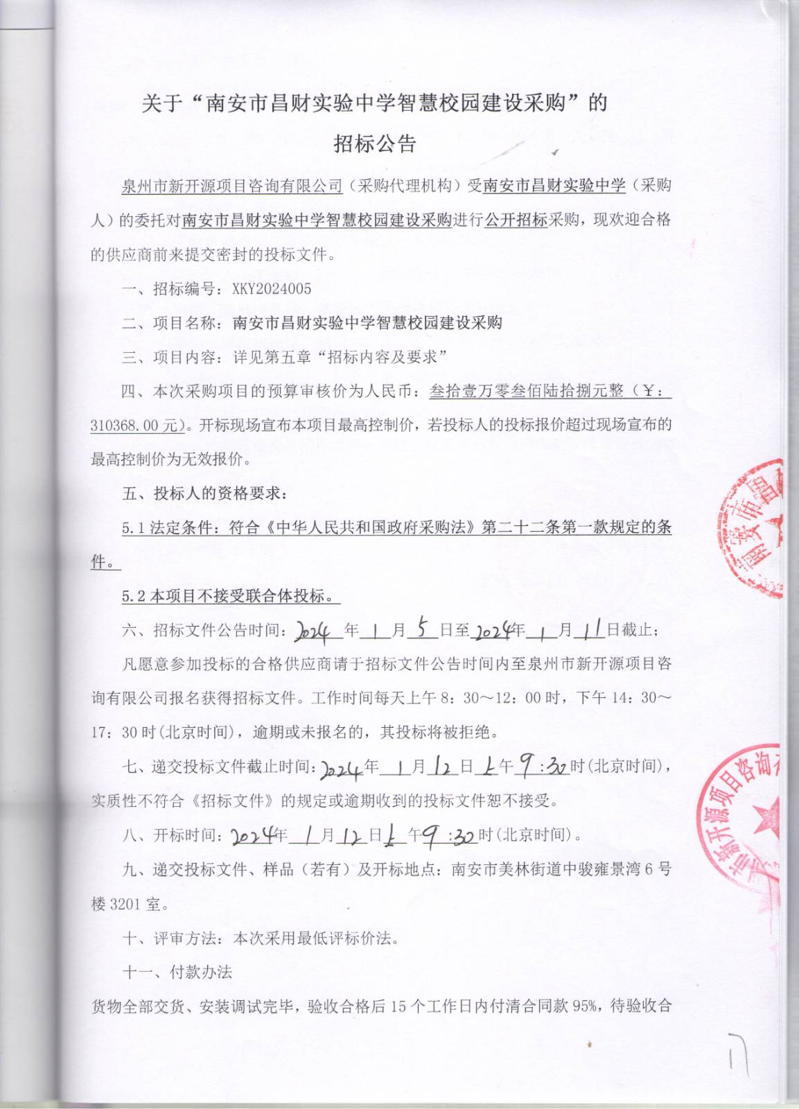 南安市昌财实验中学智慧校园建设采购项目招标公告